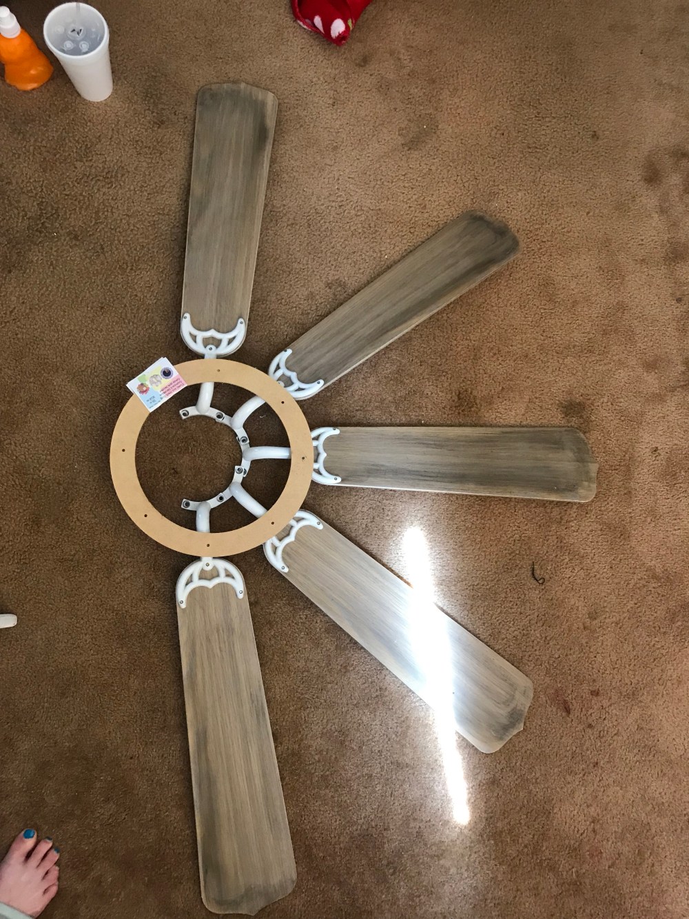 So our new house had some nasty old ceiling fans…some I couldn’t get clean and some that didn’t even work properly! So when my husband removed this white one from our living room, and was about to throw it away, I noticed it has this great (dingy) brushed wood look to it. And it cleaned up okay! So I decided to make a windmill of sorts to use as decor! We are, after all, living the farm dream now! I had my husband cut off the curved ends, and bend a hanger for me-his skills (and tools) do come in handy sometimes! I’m so happy in how it turned it!