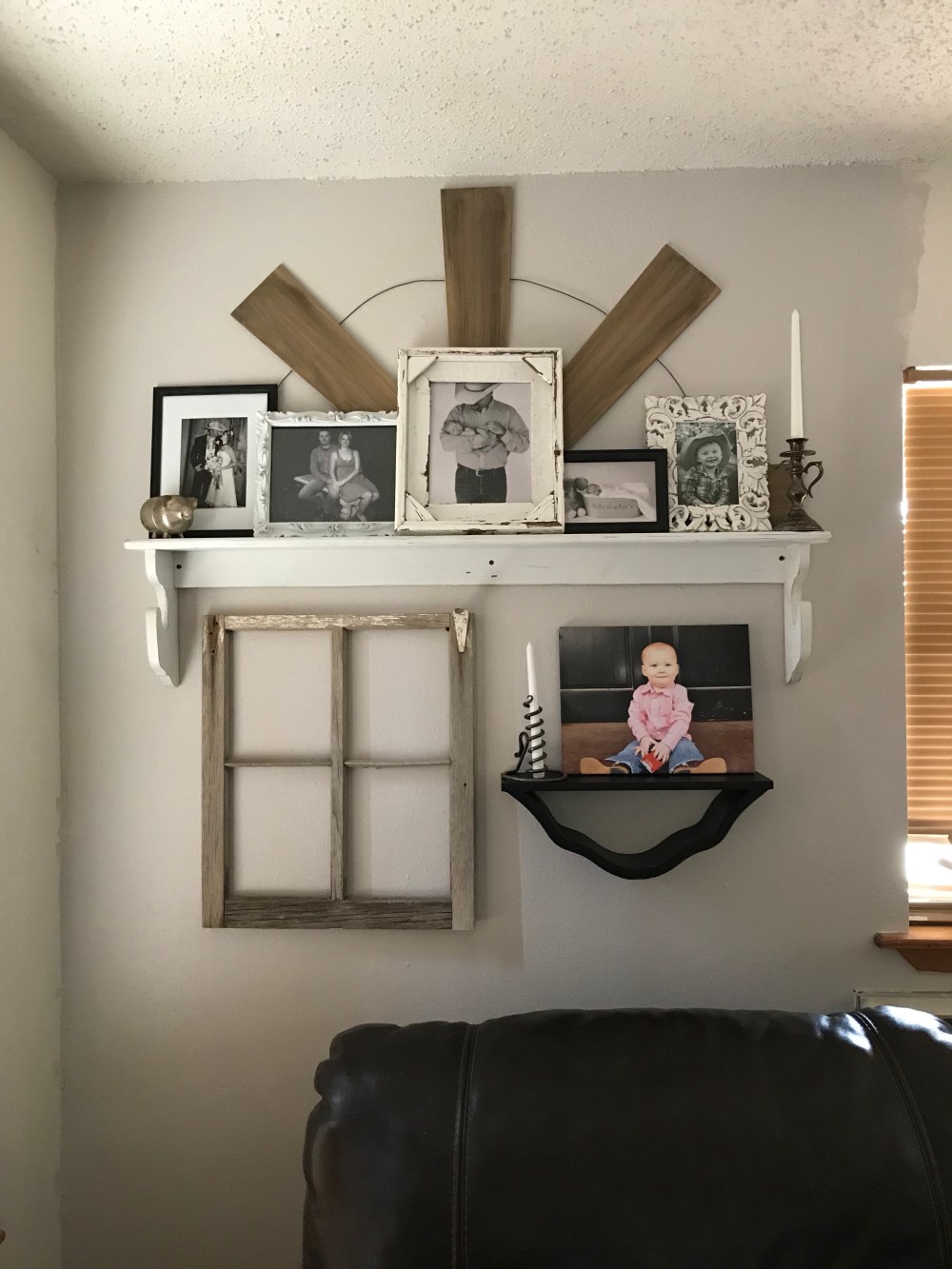 Notice how I am literally painting one section at a time? It’s easier for me to manage this way! That shelf has been with me for about 14 years! It was my first rescue. It’s actually a quilt rack. And that window frame. Y’all, it is special. We have quite a few rescued old windows like that. This one is from my mother-in-law’s parents farm, where she grew up! I’m really digging this monochromatic farmhouse style right now! Sprinkle in some collectibles as decor, and voila, Momma’s happy corner! Done in one Sunday afternoon!