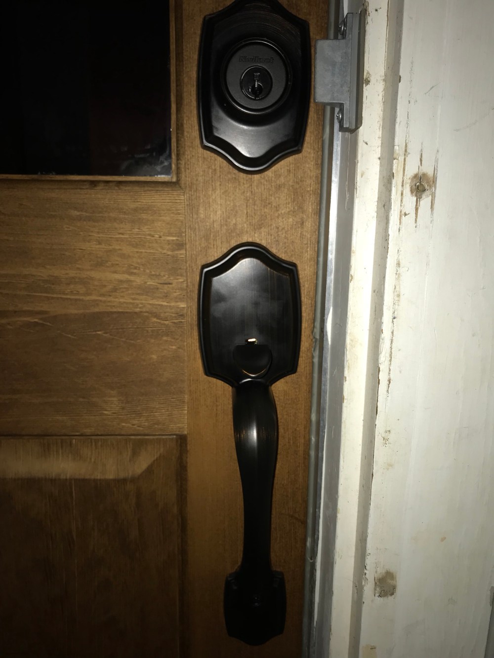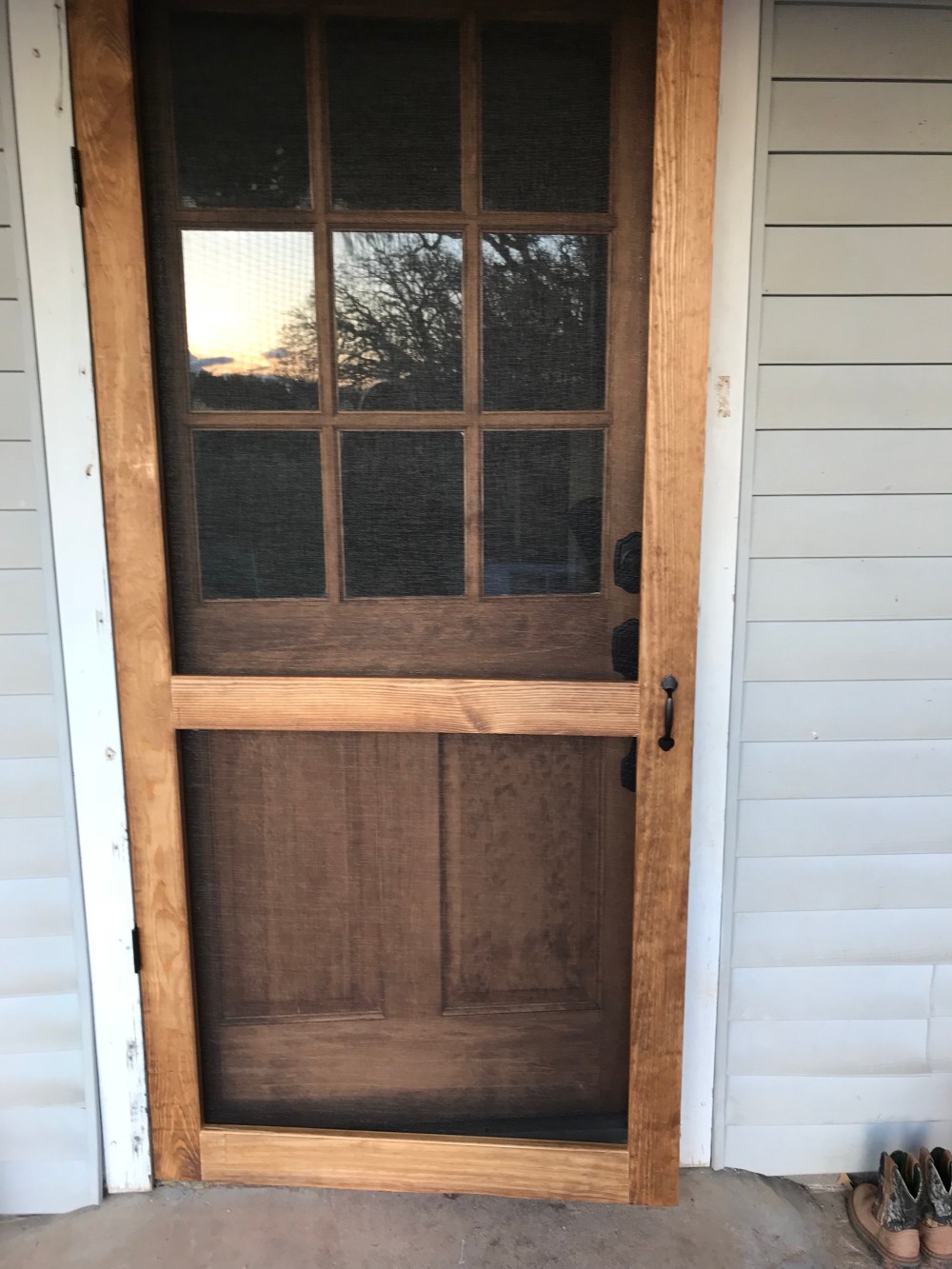 I couldn’t be happier with this thrifty find! It has a true farmhouse look and feel, without the price tag to match! I did splurge on a fancy doorknob, but I chose the least expensive one on the shelf! I chose a simple screen door because we love having the front door open but need to keep the bugs out! I chose a simple drawer pull with a matching shape instead of a traditional handle and latch.
