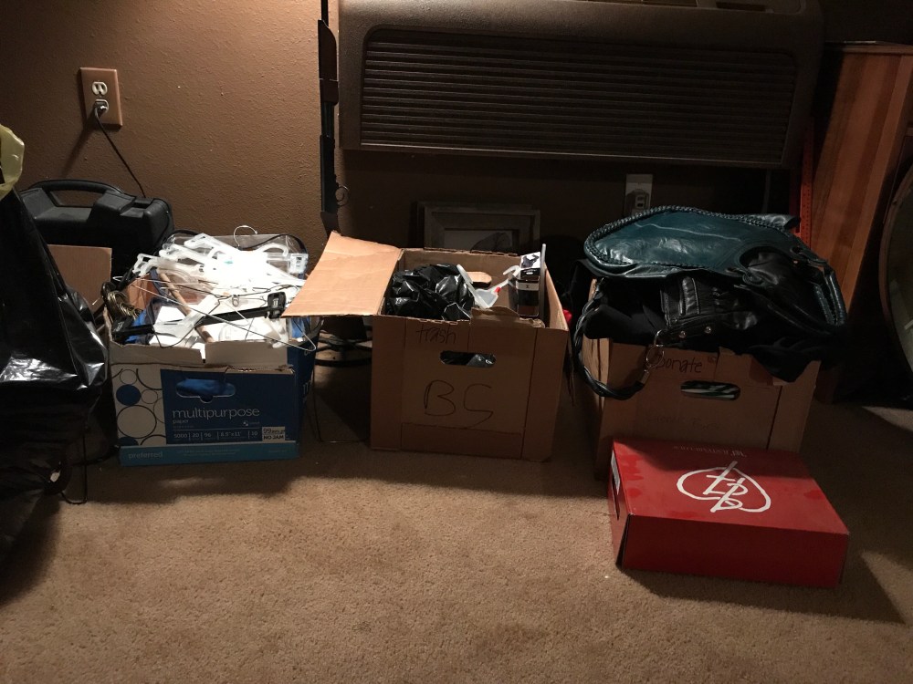 Tips: I suggest an empty box for donations as your clearing out the clutter, as well as a trash bag or box. And don’t forget one for the empty hangers!