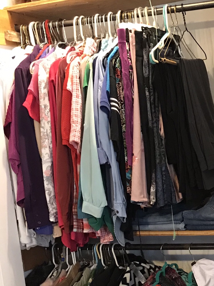 Once the shoes were conquered, I moved on to sorting my clothes by style. I chose to put jackets, scarves and hats on the bottom, because we’re moving into Spring and these items will be worn less. On the top rack, from left to right, I did my tops, skirts and then pants.