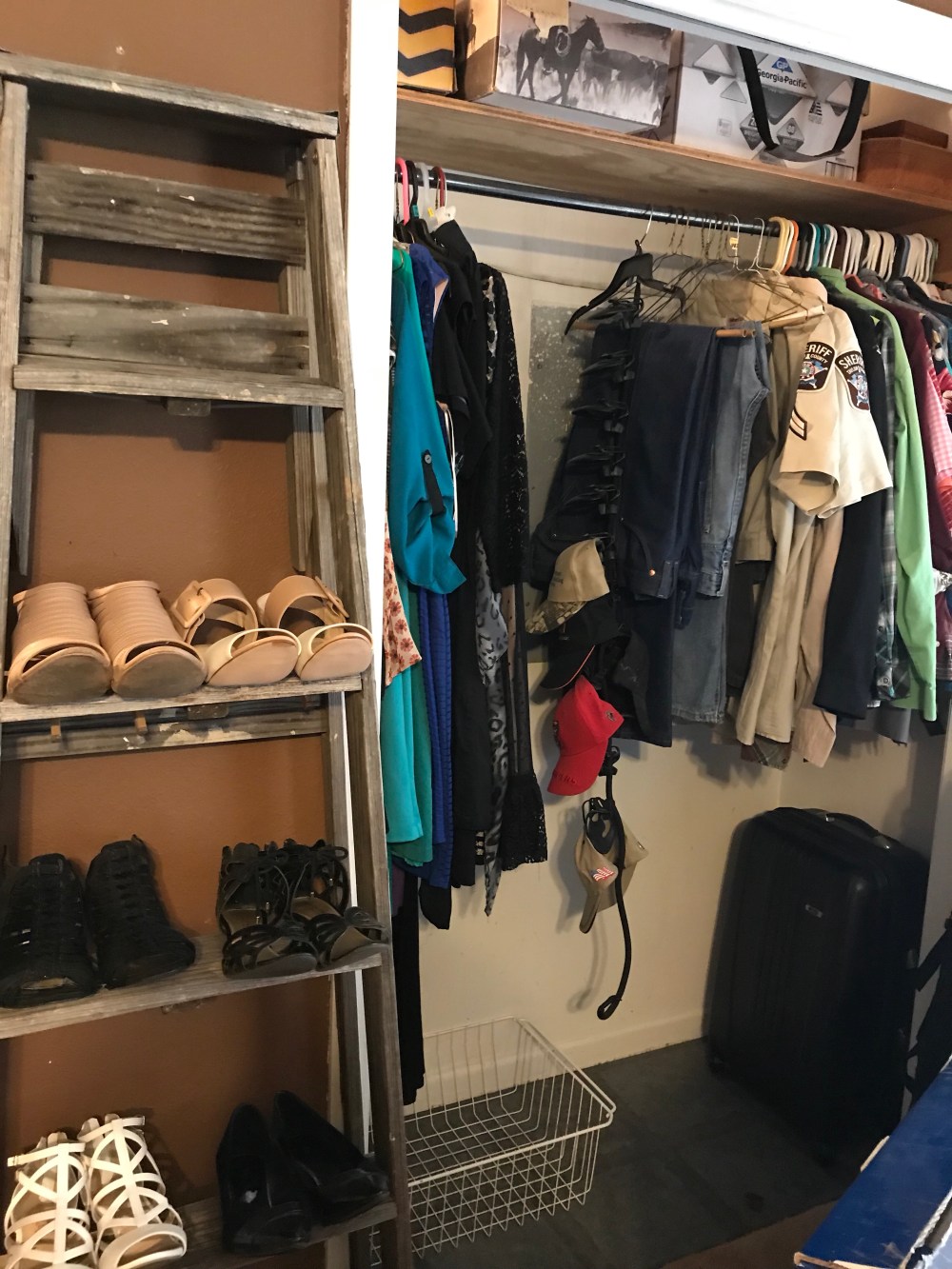 Now for His side! Well sorta! My dresses are taking up one third of his space! Again color coded. Then I separated mine from his with his cap hanger. I then mirrored my upper rack: Husband’s jeans, short sleeved shirts, followed by long sleeved. His jackets are still packed and I plan to put them in our coat closet in the family room. And besides the suitcase in the corner, his floor is currently empty! Not that he has many shoes to begin with, but he has a bigger wire basket than my two to toss his giant shoes in! He keeps his boots by the front door so that leaves some space to be utilized!