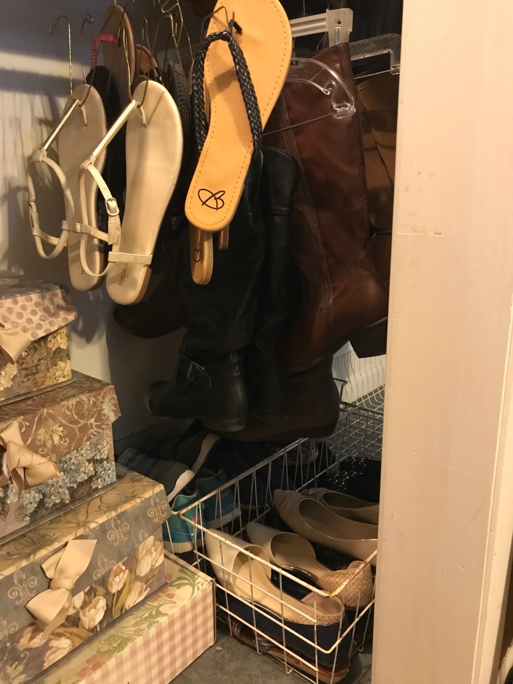 First things, to begin, remove all clutter! For me that meant getting everything off the floors. There’s just something about tidy floors that speaks cleanliness to my soul! Once I had the closet floor empty, I sat down and began work on the pile of shoes. I first organized by style: flats, tennies, boots, heels. From there I put shoes in baskets and stacking boxes, but I also hung some.