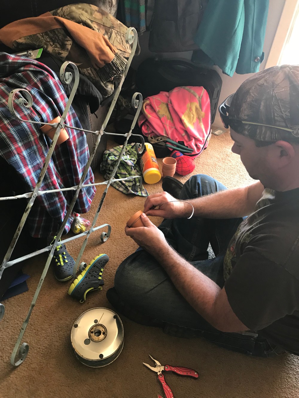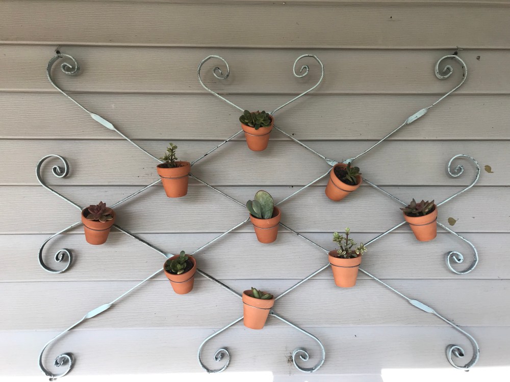 I also finally go to create a little wall garden! I had previously used this metal, stolen from an old screen door, as wall decor in my old home. Those little clay pots were 3/$1 at the Dollar Tree and Husband (lovingly) attached them with baling wire!
