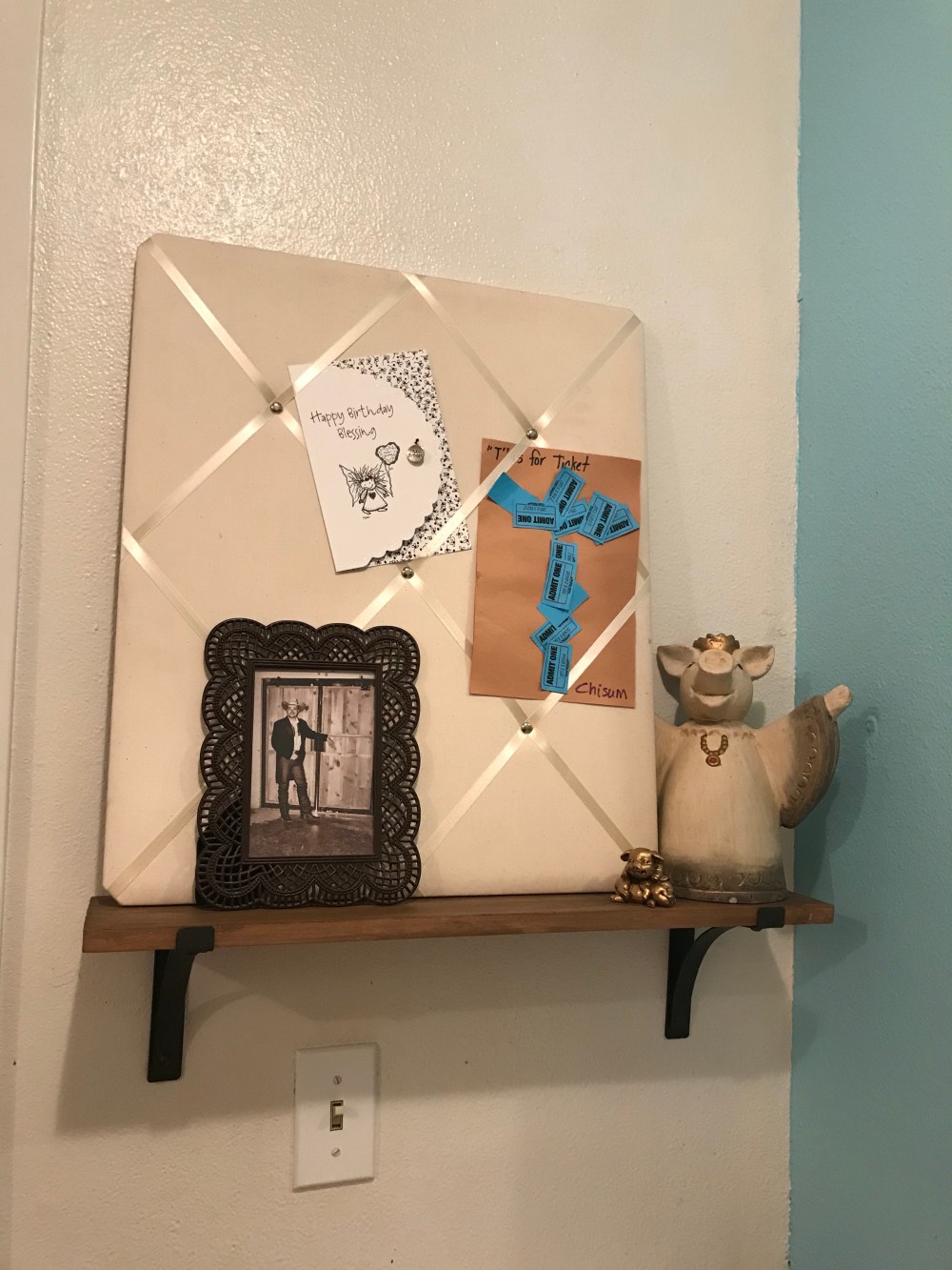 And over there I hung a shelf to house all my pretties! Little tokens of love and things that make me happy, like this memo board, currently with a piece of Chisum’s art and a birthday card from my in-laws, as well as a favorite photo of my main man!