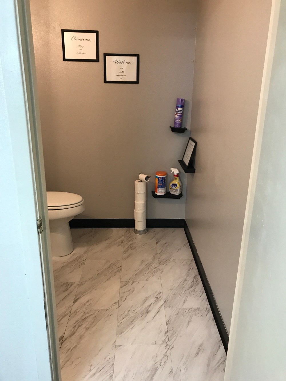 Step 3. Decorate. I chose to keep the black floor border, paper towel holder, white mirror, as well as the sink and faucet. I did do a little toothbrush scrubbing to get that faucet looking sparkling-new again! Of course, I also could not change out the ceiling tiles. We had some black Dollar Tree picture frames lying around that I had previously used in my office, and I simply chose a bible verse, had it handwritten on some good cardstock, framed and hung! I also purchased 3 small black shelves to serve as cleaning supply stock instead of getting a bulky cabinet to mount that would hide the supplies, or keeping them stashed on the floor in the corner. (We keep only what is necessary and backstock the rest of our office cleaning supplies.) The reason for doing this is to help keep this bathroom clean at all times as it serves as our customer bathroom as well as for the office staff. I also purchased a new switch-plate, small trash can, toilet paper holder and scrub brush holder. All in white and silver to keep that color scheme and this appearance of cleanliness flowing throughout the space. We did find a decent black light fixture, something simple with clean lines to replace the old. This is probably my least favorite item in the new bathroom, but it was only $9, and we left the glass globe off of it, revealing two bright bulbs.