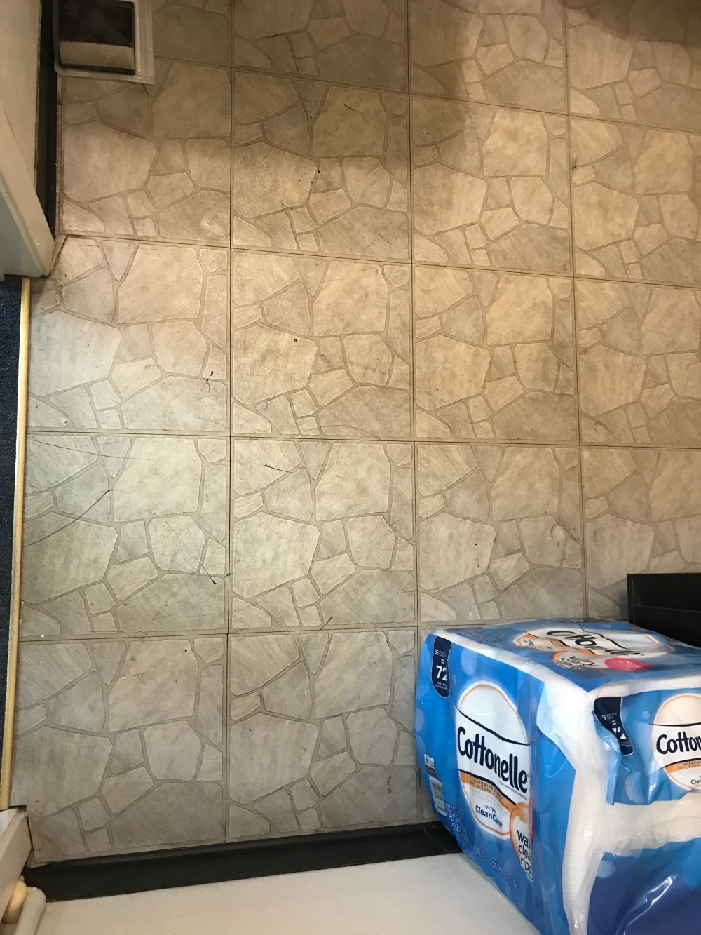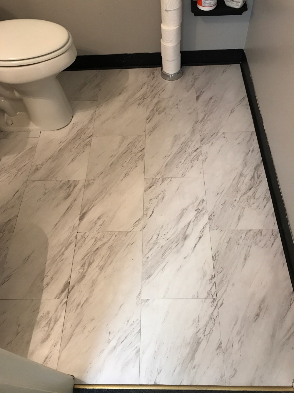 Step 2. Flooring. I chose to go right over the top of the current disgusting laminate with a peel & stick white carrerra marble-looking tile. I chose this to brighten up the space and because the grey grain matched the paint very well. And I picked 2′ by 1′ tiles to make the space feel even larger. Then I set out to cutting and laying them! Let me tell you, I learned A LOT in this process! I made a few mistakes but had over-bought for exactly that reason! But it’s such a quick and easy process and made a huge impact! I will likely use this product again!
