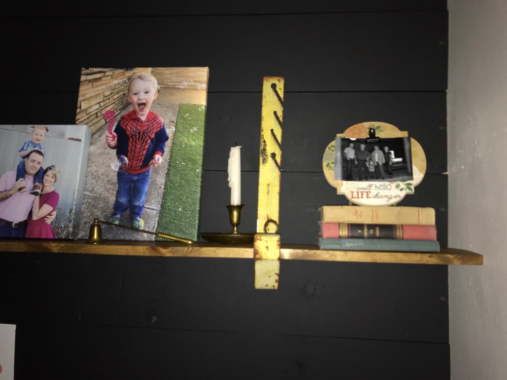 I’ve been hoarding them to use for just such a shelf! I have more, but I just wanted the one shelf in this area, so you will likely see these again in future! Husband and I went back and forth on the color of the shelf, matte black or stained wood? Ultimately Chisum chimed in with his vote for “just wood”, and it really was a pretty piece of wood, so we went with it and I love how it turned out! And how it added that little bit of nature, keeping that modern farmhouse feel I’m going for!