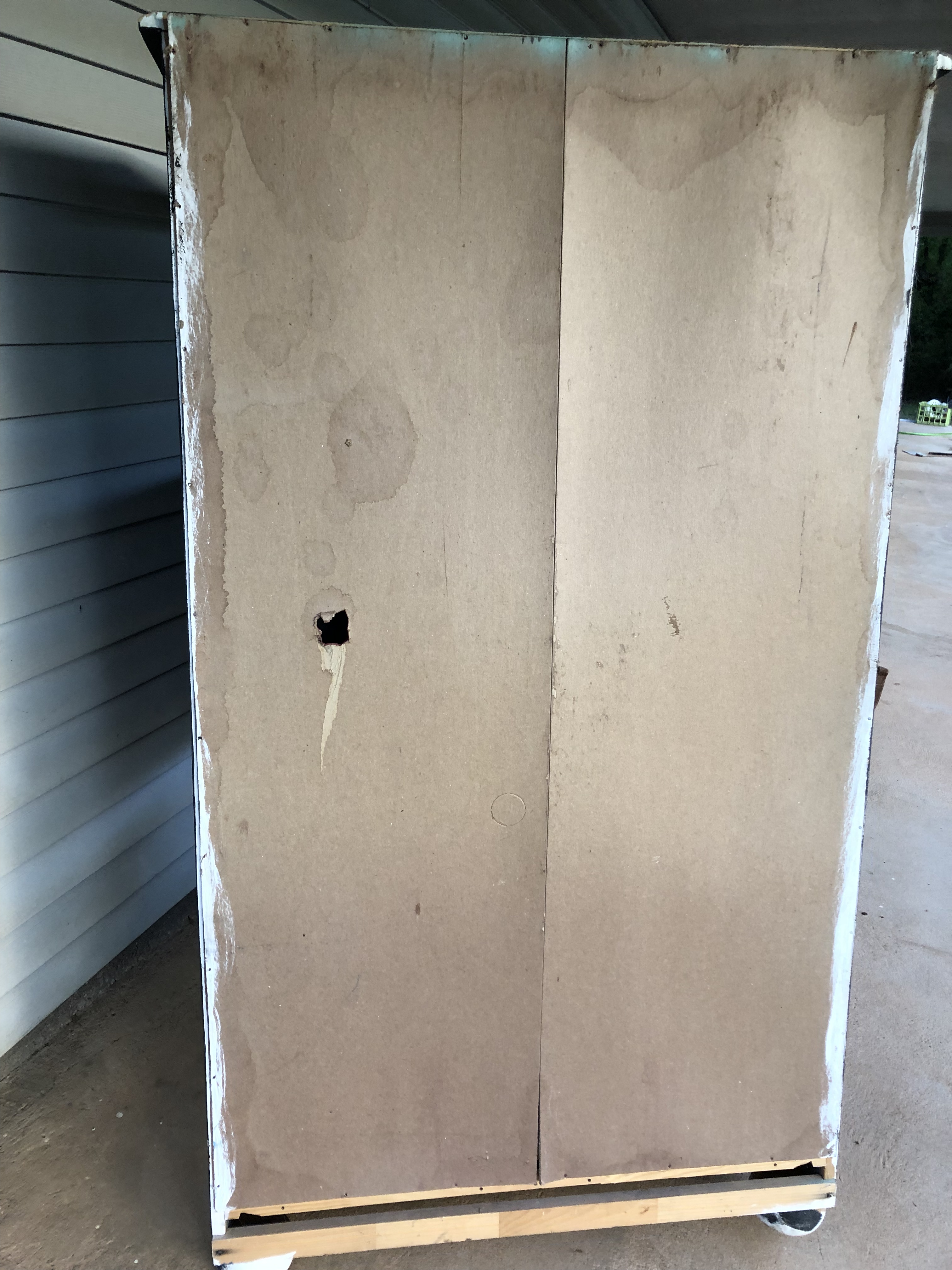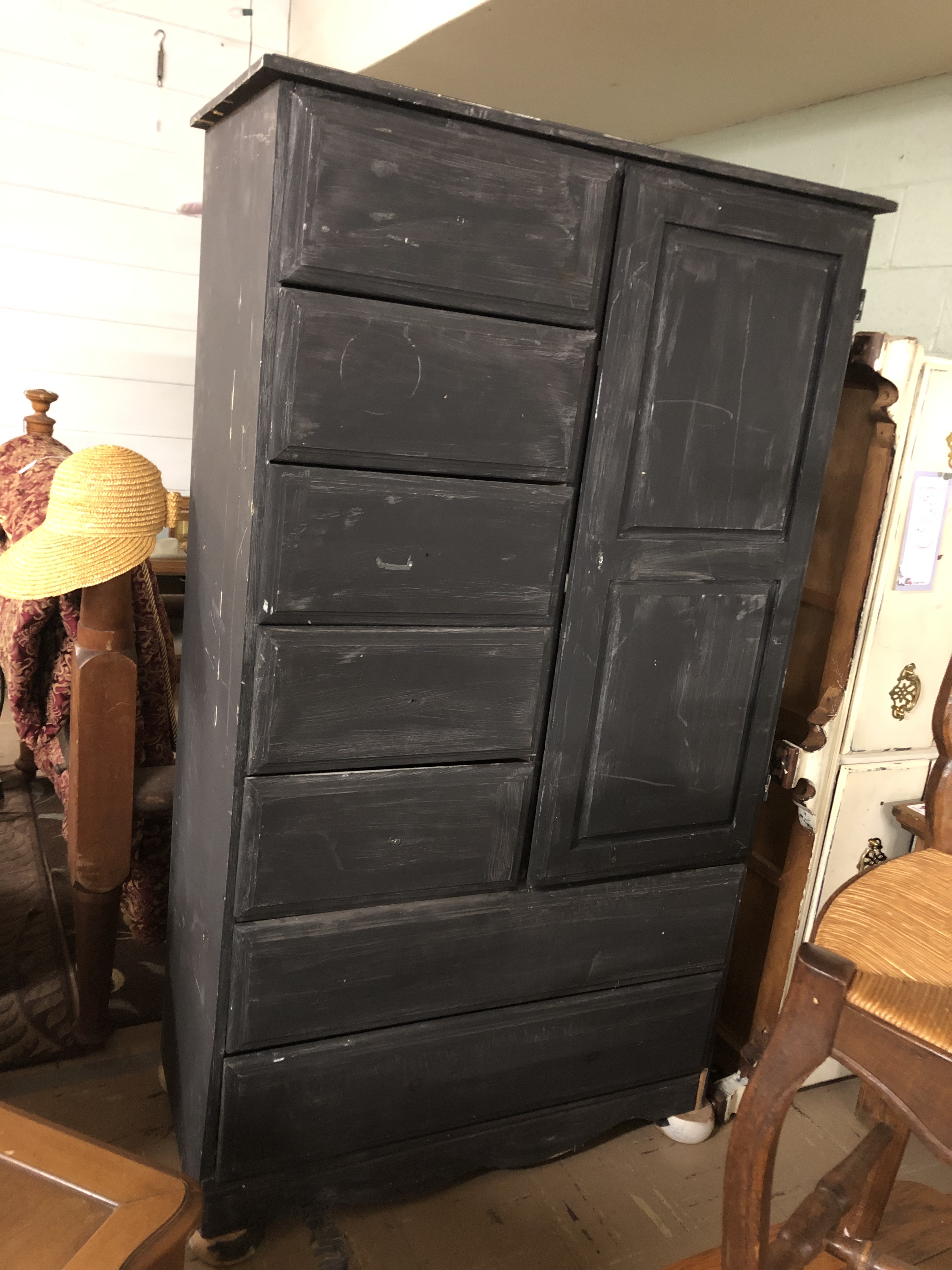 I wasn’t even quite sure what to call it. The label literally read “Hideous project piece, $25”! That’s right just $25, how could I protest? Once we were in the car, I immediately began researching, because, like I said, I wasn’t quite sure exactly what it was. I had ideas and wanted to call it a wardrobe but knew that wasn’t right. Turns out it’s a type of Chifforobe. Derived from the words chiffonier and wardrobe, a piece of furniture that combines drawers and a closet-like space for hanging. This type of furniture dates back to about 1905 in America! A good antique one could cost upwards of $1000. I couldn’t find anything similar on sites such as Wayfair, but a new wardrobe or armoire with a mirror would run $500+, for a good wooden one. Chifforobes or chifforettes became more prevalent in the Depression Era, because it was multi-functional and affordable.