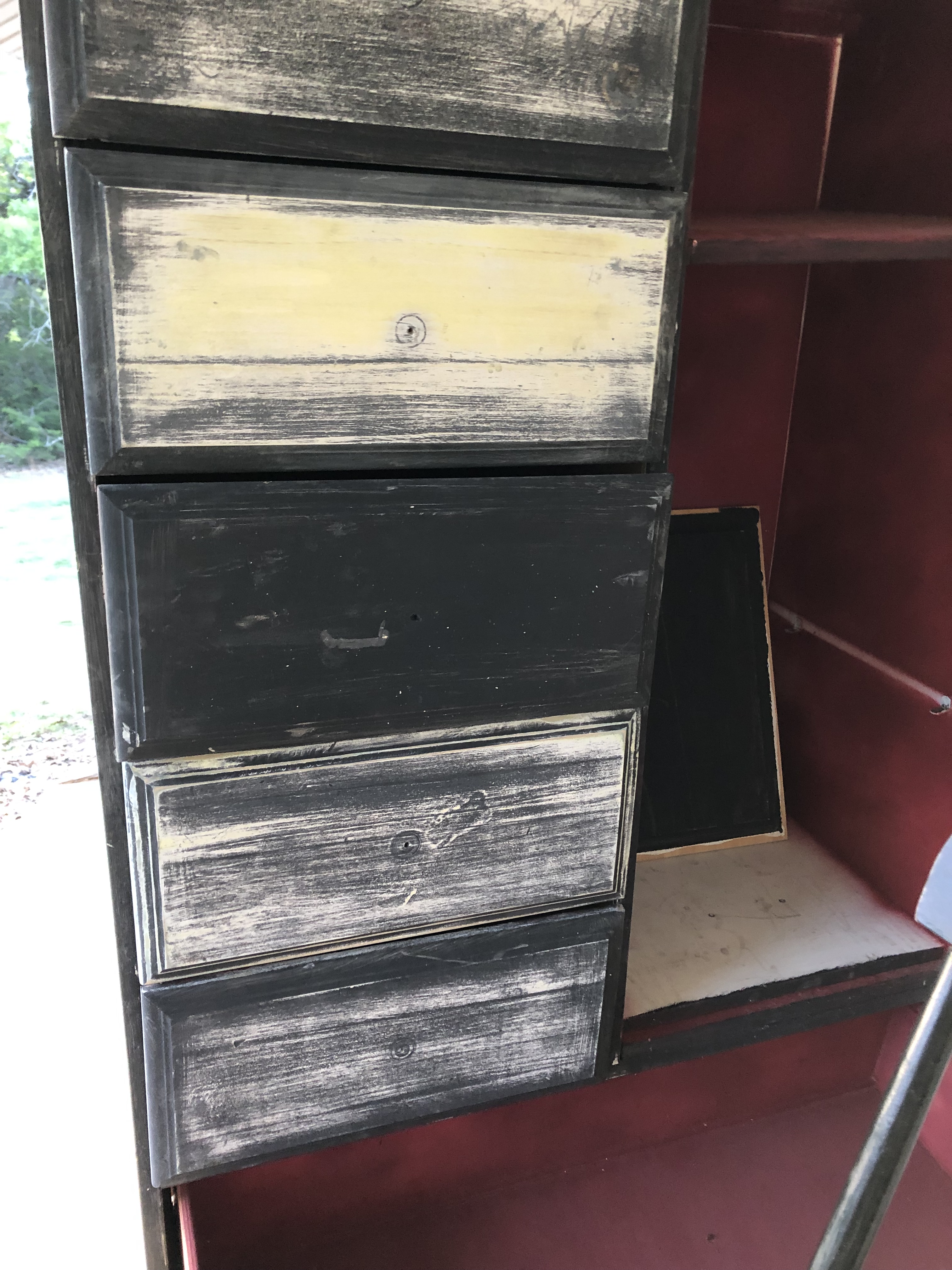 I started hitting the good wood exterior with my orbital sander. I first wanted to see how many layers of paint there were and what kind of wood I was dealing with. But the hideous black paint gunned up my sander and I had to change the sandpaper for each drawer to avoid causing damage to the wood. My best guess is that the black layer is some sort of homemade chalk paint. No doubt I’ll have to go back with a higher quality chalk paint to make it look right. For now, the plan is to lightly sand it, smoothing out the ugly brush strokes, then prime and paint. I’m thinking white! With a pretty surprise interior, and of course some lovely knobs.
